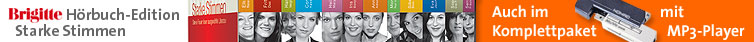 auf audible.de: Zwölf starke Frauen lesen ausgewählte Literatur München, 17. Februar 2005 audible.de, das deutsche Internet-Portal für den Download von Hörbüchern und weiteren gesprochenen Inhalten, ist exklusiver Download-Partner für die im Februar 2005 startende BRIGITTE Hörbuch-Edition "Starke Stimmen". Dabei handelt es sich um eine Kooperation zwischen Random House Audio und der Verlagsgruppe BRIGITTE (Gruner + Jahr). "Starke Stimmen" umfasst zwölf Hörbücher, die von charismatischen Frauen und prominenten Schauspielerinnen wie Elke Heidenreich, Iris Berben, Senta Berger oder Heike Makatsch gelesen werden. Ein großer Teil der Hörbücher wurde exklusiv für diese Hörbuch-Edition aufgenommen. Die Hörbücher aus der BRIGITTE-Hörbuch-Edition "Starke Stimmen" erscheinen ab dem 02. Februar 2005 (BRIGITTE Heft 4) im Zweiwochen-Rhythmus und stehen jeweils sofort nach dem Erscheinen auf audible.de zum Download zur Verfügung. Jedes einzelne Hörbuch kostet 9,95 Euro, die Gesamt-Edition mit zwölf Hörbüchern gibt es zum Vorzugspreis von 99,- Euro. Für mobilen Hörgenuss schenkt Audible den ersten 100 Bestellern der gesamten Hörbuch-Edition den MP3-Player MuVo von Creative Labs. Danach ist der MuVo bei diesem Aktionsangebot gegen eine Zuzahlung von 20,- Euro erhältlich. "Starke Stimmen" wird von prominenten Frauen gelesen. Zum Auftakt liest Elke Heidenreich "New Yorker Geschichten" von Dorothy Parker; es folgt Fritzi Haberland mit "Das kunstseidene Mädchen" von Irmgard Keun (16.02.05). Hannelore Hoger entführt in "Vergiss nie, dass ich dich liebe" den Hörer in spannende Kriminalgeschichten von Elizabeth George (02.03.05); Corinna Harfouch leiht ihre Stimme Christa Wolfs "Kassandra" (16.03.05). Weitere "Starke Stimmen" sind Heike Makatsch (30.03.05), Iris Berben (13.04.2005), Anna Thalbach (27.04.05), Monica Bleibtreu (11.05.05), Sibel Kekilli (25.05.05), Eva Mattes (08.06.05) und Sophie Rois (22.06.05). Zum Abschluss liest Senta Berger "Fräulein Else" von Arthur Schnitzler (06.07.05). "Interessante Inhalte, charismatische Frauenstimmen und eine starke Marke wie BRIGITTE - diese Kombination hat uns einfach begeistert", so Arik Meyer, Geschäftsführer der Audible GmbH. "Bei audible.de kann man die "Starken Stimmen" einfach und schnell aus dem Internet auf den Computer herunterladen und auf ein mobiles Gerät, z.B. einen MP3-Player wie den iPod, überspielen." Antje Dittrich, Stellvertretende Verlagsleiterin Verlagsgruppe BRIGITTE und Geschäftsführerin von BRIGITTE.DE: "Brigitte ist die erste Zeitschrift in Deutschland, die ihren Print- und Online- Leserinnen ein Komplettpaket anbieten kann. Denn die Hörbuch-Edition ist sowohl ganz normal auf CD erhältlich als auch über den innovativen Service von audible.de. Unser Online-Auftritt komplettiert damit erfolgreich sein Angebot von aktuellen Beiträgen, Hintergrundinformationen und Hörproben." |